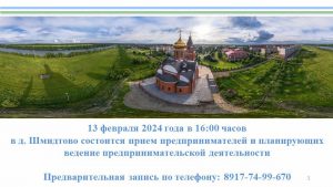 ☑️ 13 февраля в 16:00 часов в сельском поселении Русско-Юрмашский сельсовет МР Уфимский район РБ (д.Шмидтово, ул.Мира, 2) совместно с общественным помощником Уполномоченного по защите прав предпринимателей в Уфимском районе проведём приём предпринимателей и граждан, планирующих открыть своё дело. В рамках приёма будут освещены вопросы ведения бизнеса и действующие меры поддержки предпринимательства.