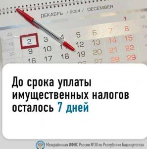 До срока уплаты имущественных налогов осталось 7 дней! Срок для своевременной уплаты транспортного, земельного налогов и налога на имущество физических лиц за 2023 год истекает 2 декабря 2024 года. Если до настоящего времени налоговое уведомление не получено, то его можно получить в отделении МФЦ или в любом налоговом органе, а также в «Личном кабинете налогоплательщика» на сайте ФНС России или на портале Госуслуг, направив соответствующее согласие. Уплатить налоги просто: – с помощью сервисов «Личный кабинет налогоплательщика» и «Уплата налогов и пошлин»; – в мобильном приложении «Налоги ФЛ»; – на портале Госуслуг; – в платежных терминалах и онлайн-сервисах банков, отделениях федеральной почтовой службы.
