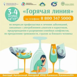 В преддверии Всемирного дня трезвости и борьбы с алкоголизмом, который состоится 3 октября, будет проведена «Горячая линия» по вопросам зависимостей, семейных конфликтов, тревожности и страхов за близких. Очень часто зависимость не только разрушает жизнь алкоголика, но и влияет на его окружение. К сожалению, эта проблема остаётся актуальной для современного общества. ️3 и 4 октября с 14:00 до 17:00 вы можете позвонить на номер 8 800 347 5000 и задать вопросы, связанные с медицинскими, социальными, психологическими и юридическими аспектами семейных проблем. Консультация будет анонимной и бесплатной. Специалисты помогут вам разобраться в ситуации и получить максимально подробную информацию. Не упустите шанс изменить свою жизнь к лучшему! Поделитесь записью: для кого-то этот звонок может стать спасительным шансом!