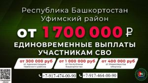 В Уфимском районе и по всей республике продолжается набор на военную службу по контракту. Всю информацию о поддержке военнослужащих и их семей можно найти на официальном сайте администрации Уфимского района: ufim.bashkortostan.ru, позвонив в военный комиссариат района по телефонам: +7(347)281-03-18; +7(347)272-02-05, или посетив их офис по адресу: г. Уфа, улица Левитана, 45. Присоединяйся к нашей команде, стань опорой страны и защити своё будущее и будущее своих детей! Служи по контракту!